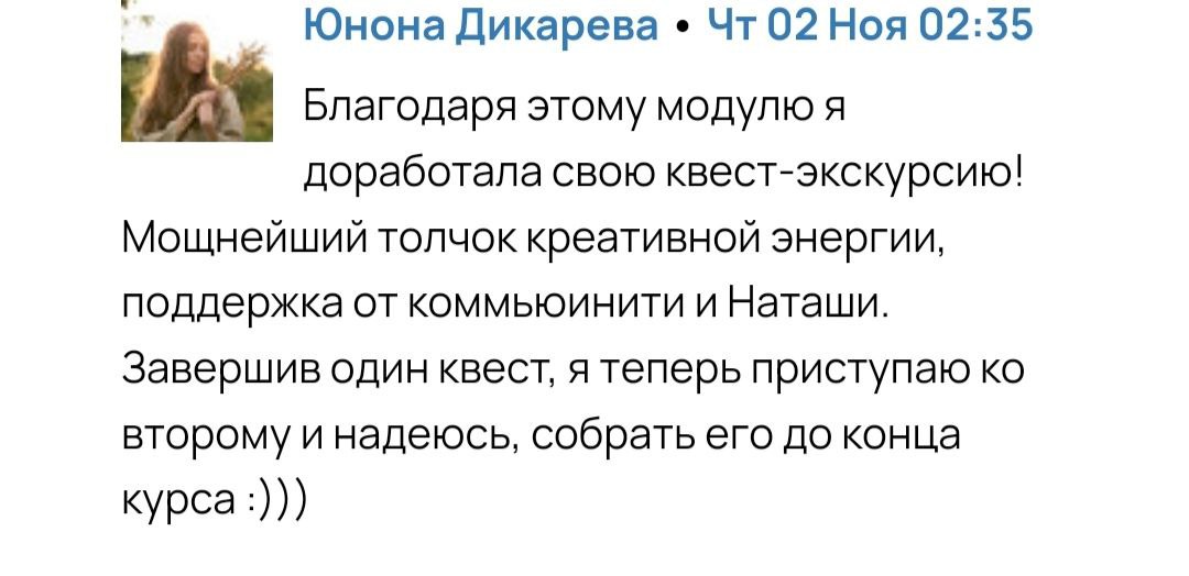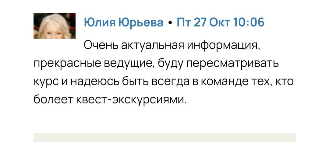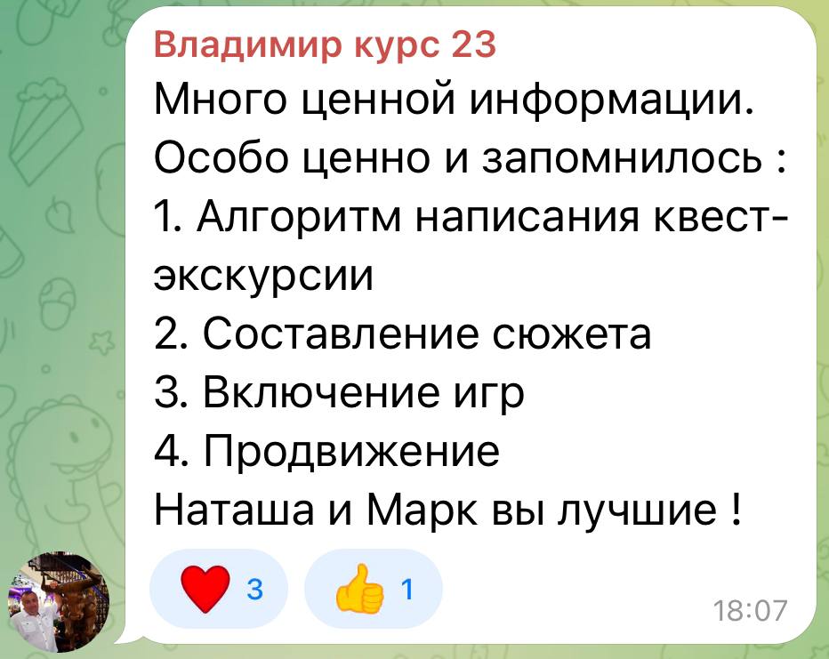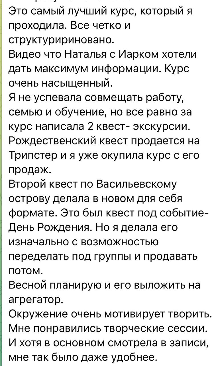 Пока все ученики, которые приходили с теми же опасениями, писали после нескольких лекций “Наташа, что ты со мной сделала. Раньше я не знала, где взять идеи, теперь их столько, что я не знаю, какую реализовывать.” Если вы хотите сочинять квест-экскурсии и готовы слушать лекции и выполнять задания, то я обещаю вас сделать эффективным творцом) А вести квест-экскурсии самому вовсе необязательно. Есть другие пути — и мы про них расскажем.